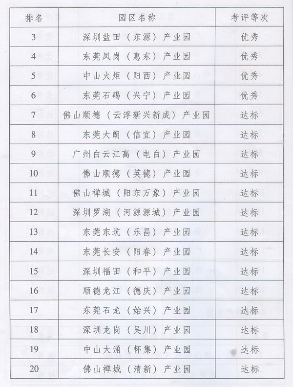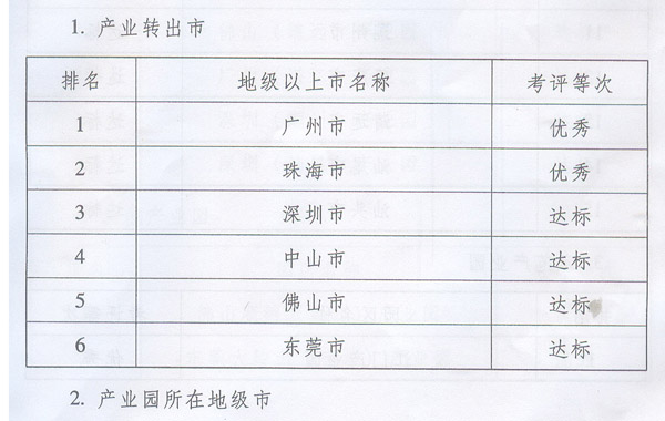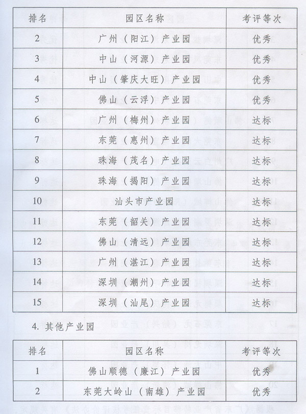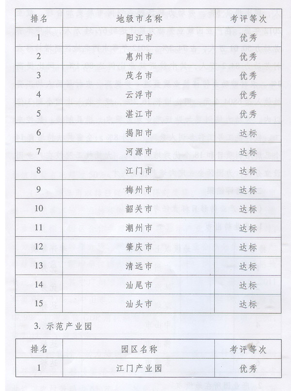 根據(jù)《廣東省產(chǎn)業(yè)轉(zhuǎn)移目標(biāo)責(zé)任考核評(píng)價(jià)辦法》有關(guān)規(guī)定,特對(duì)評(píng)定為優(yōu)秀等次的廣州、珠海、陽(yáng)江、惠州、茂名、云浮、湛江等7個(gè)地級(jí)以上市政府和江門(mén)產(chǎn)業(yè)園、廣州(陽(yáng)江)產(chǎn)業(yè)園、中山(河源)產(chǎn)業(yè)園、中山(肇慶大旺)產(chǎn)業(yè)園、佛山(云?。┊a(chǎn)業(yè)園、佛山順德(廉江)產(chǎn)業(yè)園、東莞大嶺山(南雄)產(chǎn)業(yè)園、深圳鹽田(東源)產(chǎn)業(yè)園、東莞鳳崗(惠東)產(chǎn)業(yè)園、中山火炬(陽(yáng)西)產(chǎn)業(yè)園、東莞石碣(興寧)產(chǎn)業(yè)園等11個(gè)園區(qū)予以全省通報(bào)表?yè)P(yáng),并按照有關(guān)規(guī)定給予相應(yīng)獎(jiǎng)勵(lì)。根據(jù)《廣東省產(chǎn)業(yè)轉(zhuǎn)移工業(yè)園升降級(jí)暫行辦法》有關(guān)規(guī)定,對(duì)考評(píng)排名靠后的深圳(汕尾)產(chǎn)業(yè)園、中山大涌(懷集)產(chǎn)業(yè)園、佛山禪城(清新)產(chǎn)業(yè)園予以黃牌警告。