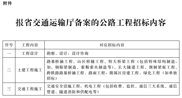 ?。ㄈ┎辉谡袠藢徟ê藴剩┮庖娬袠朔秶鷥鹊恼袠藗浒?,由各地級以上市交通運輸主管部門或招標人的上級管理單位依法確定管理方式。需報省交通運輸廳備案的公路工程招標內容具體見附件。